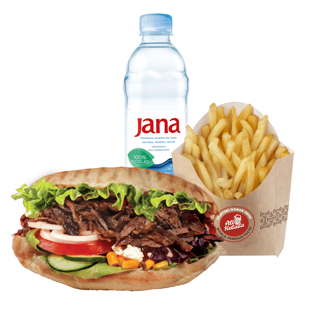 Lagano tostirana, uvijek svježa lepinja sa sočnim 100% junećim odresci, te friškim prilozima po vlastitom odabiru uz blagi umak (majoneza, vrhnje i češnjak), ljuti umak (ketchup i chilli) ili fit umak (jogurt i kopar).